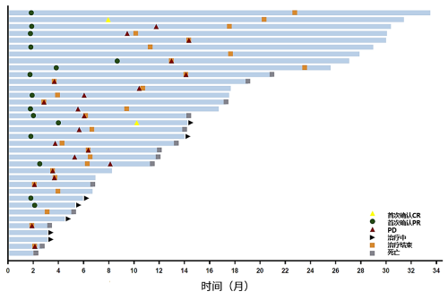 36例患者中,有13例(36.1%)在第1次影像学评估时即发生应答。截至本次数据分析,7例患者仍在接受治疗。