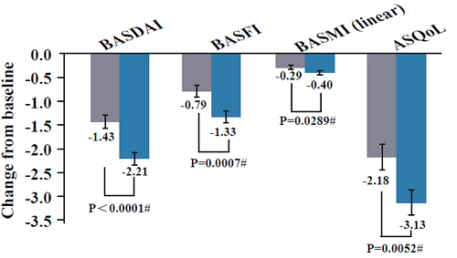 第12周时,其他健康结果及脊柱活动能力指标BASDAI、BASFI、BASMI、ASQoL、SF-36 PCS和SF-36 MCS较基线变化均较接受安慰剂治疗的受试者有改善。(图2和图3)